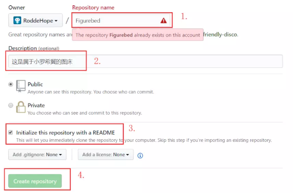 我已经建立过一个同名的repository的,所以第一步会显示红色